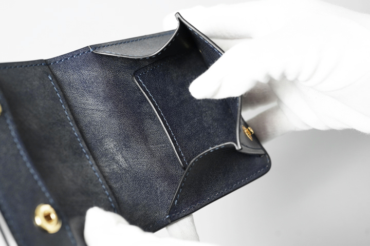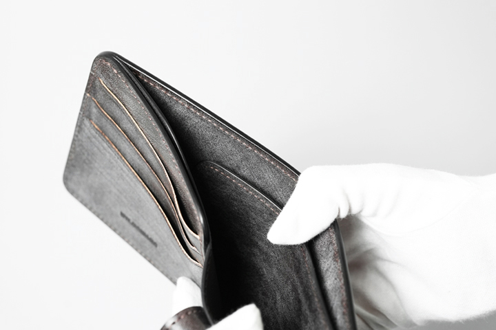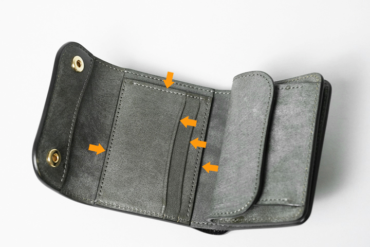 ※コインケース上部のスペースにカードなどを収納した場合、入り口付近の革や縫製が切れる可能性があるため、こちらには何も収納しないようお願いします。