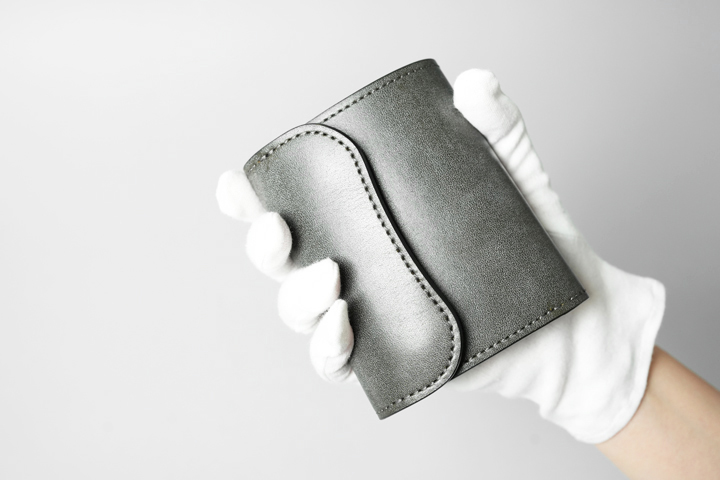 GREEN(グリーン)。「type2」シリーズで同名のカラーが登場しましたが、こちらも以前とは似て非なるカラーです。柔らかな印象を抱きやすいグリーンですが、オークバークで鞣した今回はかなりグレイッシュなグリーンに仕上がり、背筋が伸びるような凛とした表情です。隙のない雰囲気を壊さないよう、ステッチはチャコールグレーを使用しています。