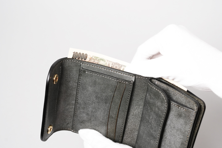三つ折りの形状を生かした札室は長く、レシートなども容易に出し入れできます。また深さも丁度よく、広々と使いやすい構造です。
