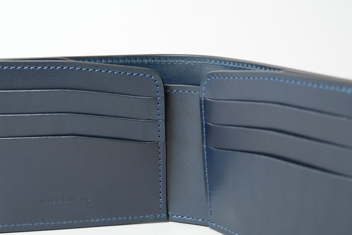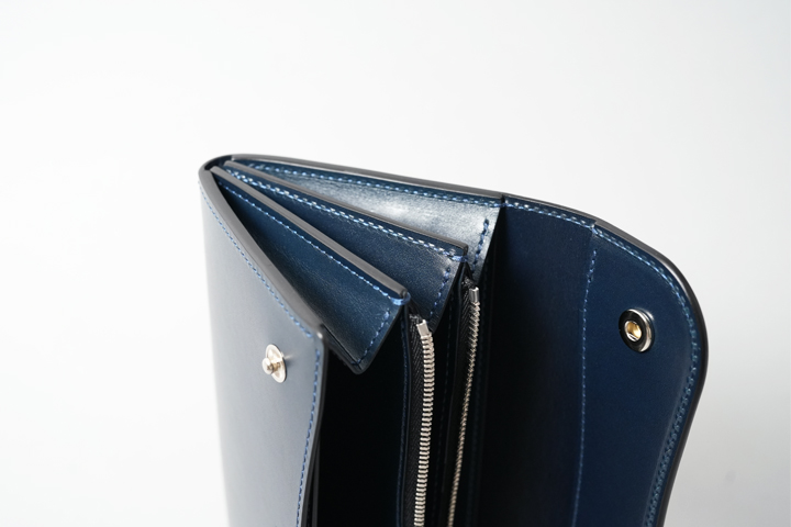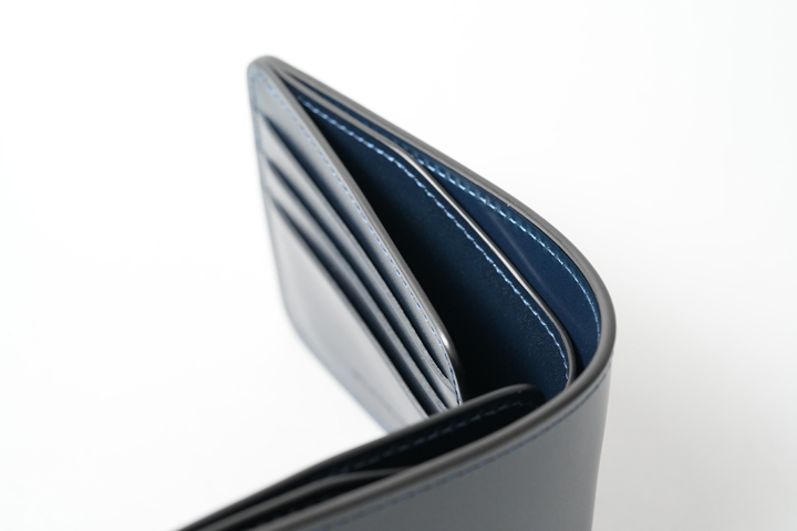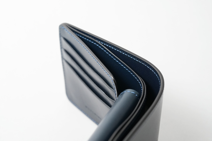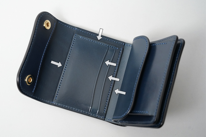 内装には片側2つずつ、計4つのササマチが備えられているので、コンパクトな収納部ですが視認性も確保されています。もちろんマチ部分のコバもきれいに磨き上げられています。