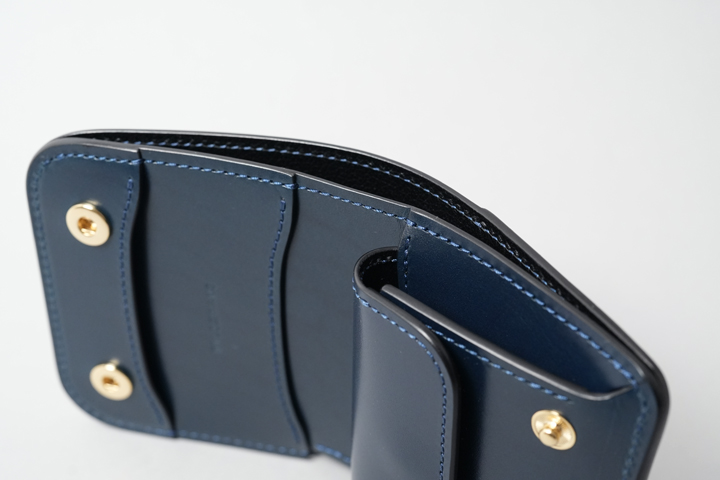 コインケースのフラップには1点のホックが付きます。コインケースは深さのあるサイズ感のため、ある程度の収納力を備えています。