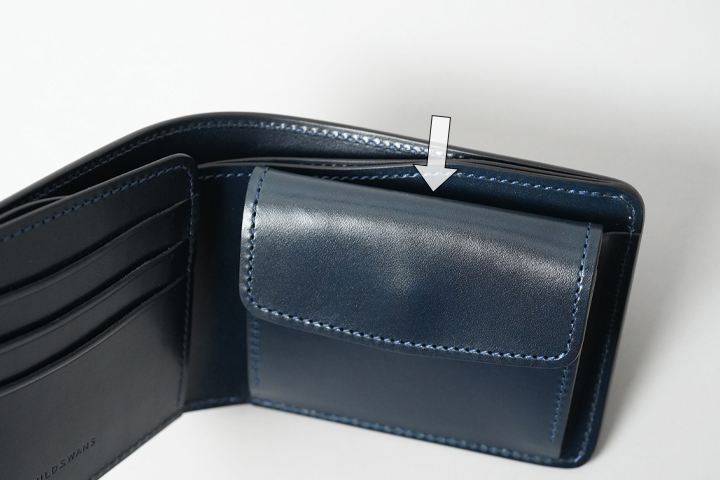 コインケースは、両側に設けられたマチにより手前に大きく開きます。こちらのマチはWILDSWANSの様々な小物製品に取り入れられている仕様となります。