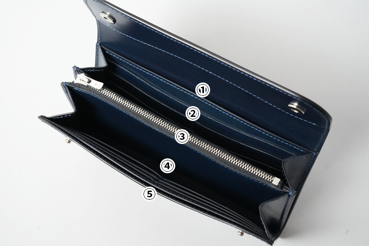 ③・・・コインケース。耐久性の高いYKKのエクセラファスナーを備えた大容量の収納部です。