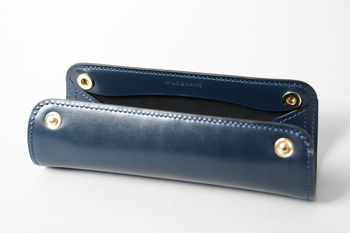 革を筒状に丸めてペンを収納するタイプのケースで、外装には切れ目の無い一枚革を使用しています。
