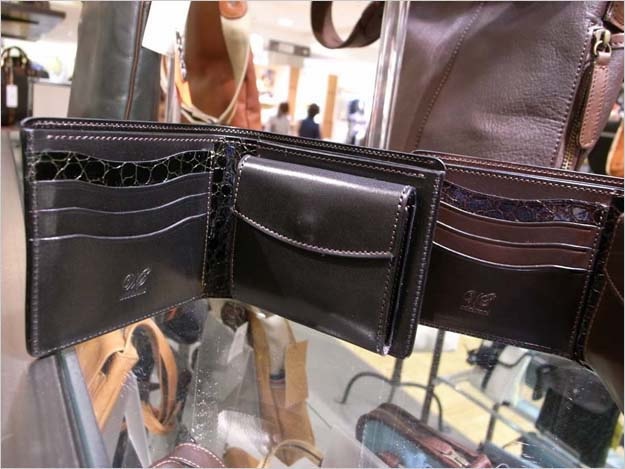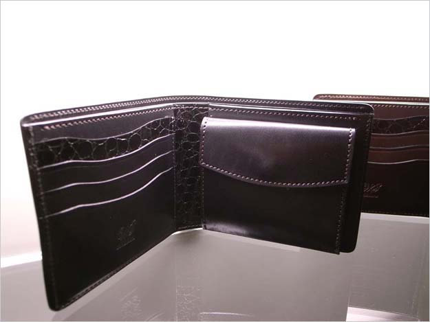 銀座の三越さんでは、コインケース付き2つ折り財布のKLEMPERER銀座三越別注バージョンが店頭に並んでいます。通常の仕様とは異なり、カード段の1部分をはじめ、部分的にクロコダイルの型押しのエナメルを使用しています。