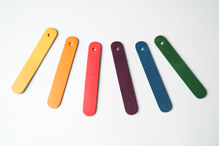 キーホルダーは、間に挟むトコ革の他に下記よりお好みのレザーとカラーを2枚お選び頂けます。