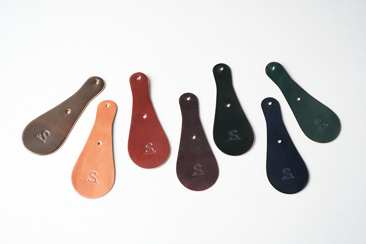 シューホーン(靴ベラ)は紳士淑女のアイテムです。何かと重宝するこちらのアイテムを手軽にご自身で製作できる機会はそうそうありません。背面は、カシメ(金具)が付いた表革の折り返し部分を除くと革のトコ面(裏面)が大部分を占める仕様です。