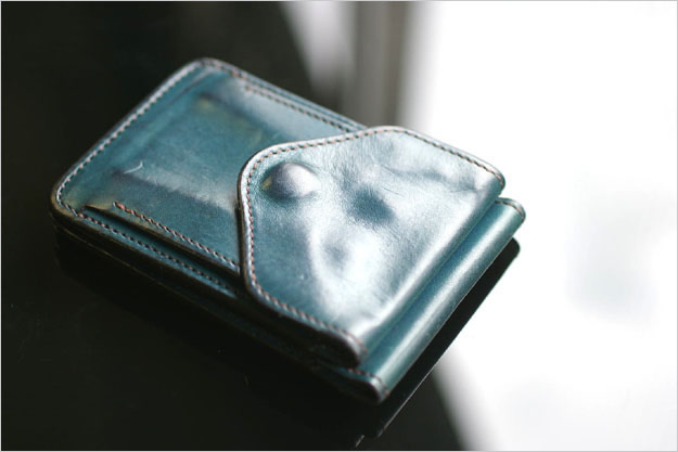 左半分のところ(表側のコインケース部分の真裏にあたるところ)には、カードが2枚収納出来ます。本体の表側と同様にカーブの付いた革の仕切りがありますので、1枚1枚の出し入れがしやすくなっています。ただ、この部分も革が馴染むまではキツイかも知れません。