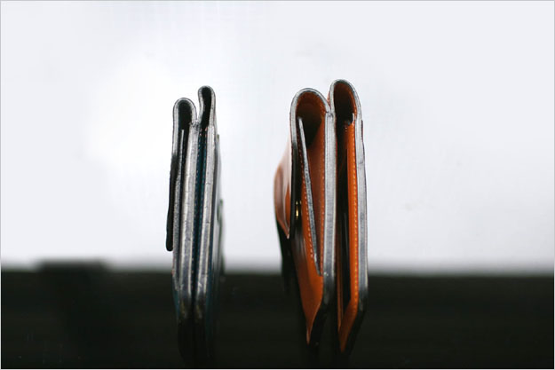 全体のボリューム感もかなり下がりました。(右側は新品の状態です。)革の厚み自体は全く一緒に設定していても、使用するとこれだけボリュームに違いが出てきます。