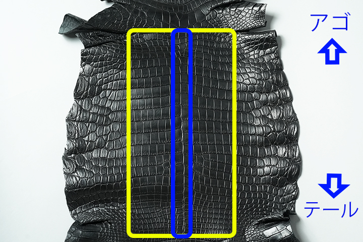 ここでWILDSWANSが定義するセンター取りについて、ご説明します。WILDSWANSにおけるセンター取りとは、上の画像のように皮革のちょうど中央のライン(青枠)にあたる部分を中心として、外枠(黄色の枠)の中から裁断を行います。天然のクロコダイルなので、たとえセンター取りであったとしても必ずしも左右の斑柄の大きさ、かたちが同じというわけではありませんがセンター取りでない個体と比べて左右の斑柄の形状が近い個体になる傾向があります。このため、一般的にセンター取りはとても贅沢な裁断方法となることから、大手メゾンなどではセンター取りでない個体に比べて、その価格自体が高価になることもしばしば見られます。