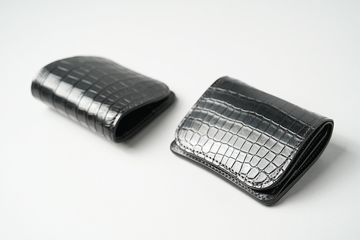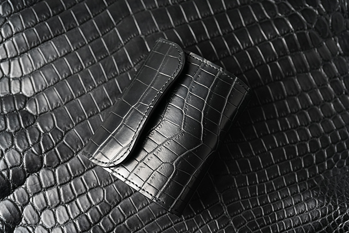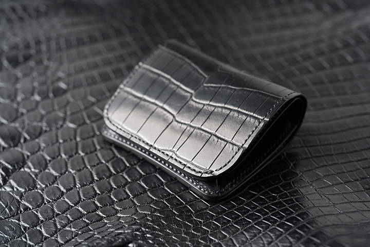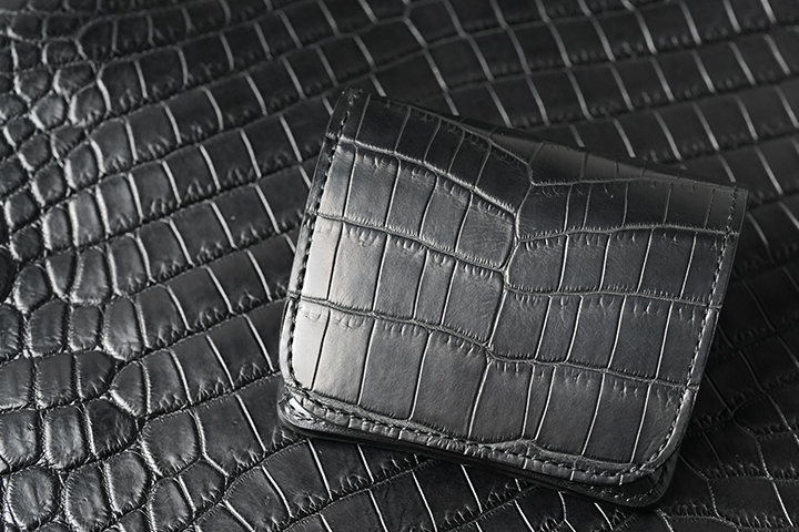 上の画像は以前販売したクロコPALM-V3ですが、こちらはセンター取りではない通常の裁断を行った個体です。先ほどもご案内したように、WILDSWANSでは中型、小型のアイテムにおいてはセンター取りを採用していません。その理由は、WILDSWANSの基本的な裁断方式が一枚の革から無駄なく裁断することが理由となり、当然価格においてもこの裁断方式が影響しています。一方でお客様からは中型、小型アイテムにおいてもセンター取りを希望されるケースも少なくありません。そこで、今回の受注会ではこのようなお客様のご要望からWILDSWANSを代表する小型、中型アイテムにおいて、センター取りのクロコダイルを外装(および一部内装パーツ)に用いたアイテムの受注会を期間限定で開催します。早速、ラインアップと受注会の概要をご紹介しましょう。