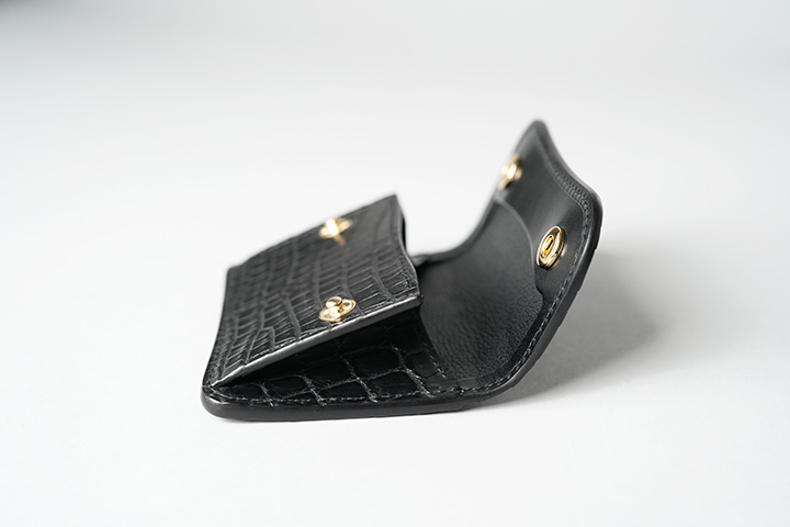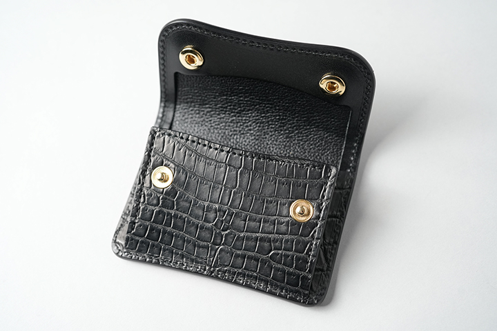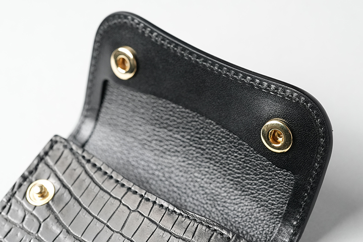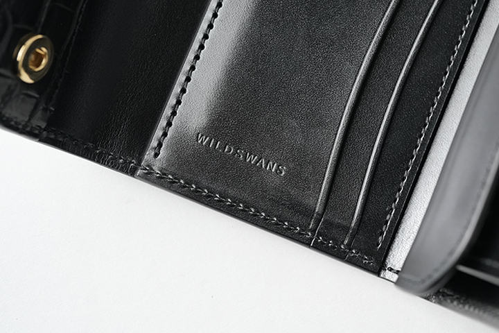 そして、フラップを開くとフラップ裏の先端もまたセンター取りのクロコダイルとなっています。小さなパーツですが、外装のイメージの余韻を内装においても続けて堪能することができます。 その他の内装部分はサドルプルアップのブラックをメインに、コインケースのマチ裏や札室内など規定の箇所に型押しの牛革/ブラックを組み合わせています。WILDSWANSのロゴはフラップの背面に刻印しています。