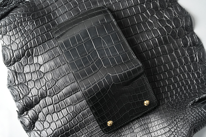 そして、CASAと同様にメインフラップの裏の先端がセンター取りのクロコダイルです。内装においてもクロコダイルとサドルプルアップ、2つの異なるレザーをお楽しみください。
