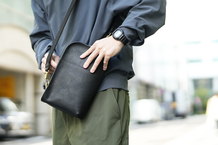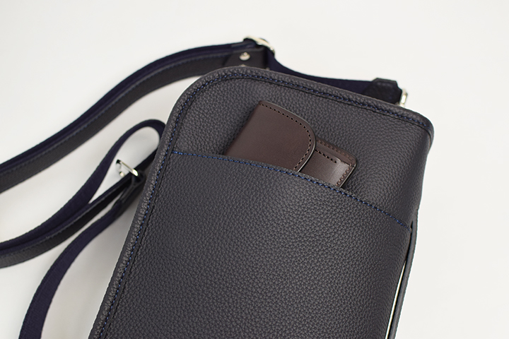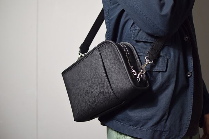また、SOLONの外装には外付けのポケットを備えています。さらに、ショルダーストラップを外して、上の画像のように本体片側のハンドストラップに手を通せば、クラッチバッグとしてもお使い頂けます。これらの点もCOLLIERとの大きな違いです。SOLONは汎用性の高さとシュランケンカーフが醸し出す上品な佇まいから、カジュアルからドレスまで様々なシーンで活躍します。こちらも現在、BLACK、NAVYの2カラーで在庫をご用意しています。