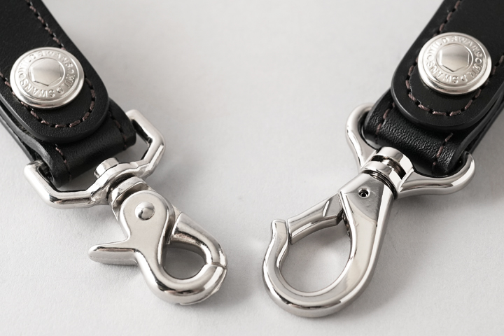 シンプルなデザインでありながら、ナスカン金具やループ状の本体といった構造によって使い方の幅が広く、それでいてしっかりと革が主役になるアイテムです。