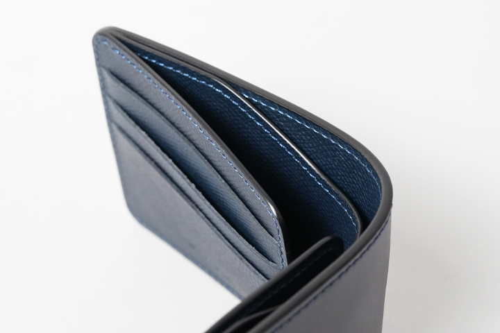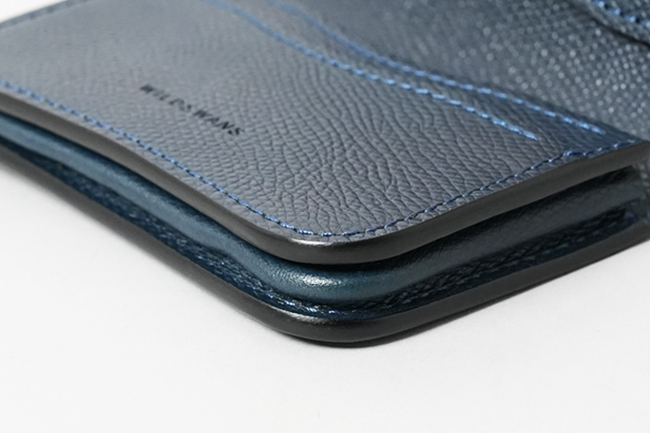 GENERALの側面には2重のコバとマチが並びます。このマチは1本の長い革パーツからつくられる「通しマチ」にひと手間を加えた構造で、このマチがカードの収納枚数に応じて伸縮します。