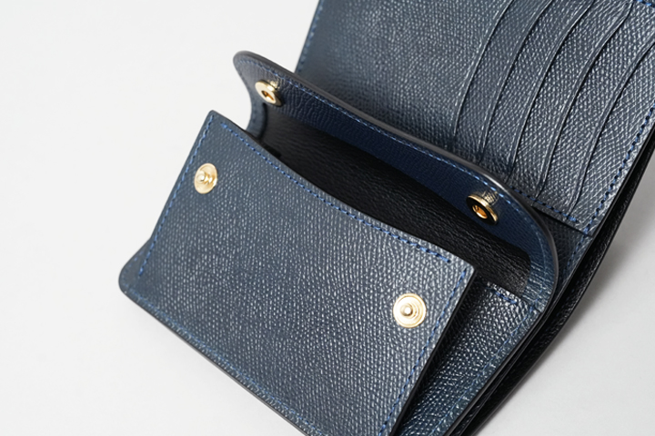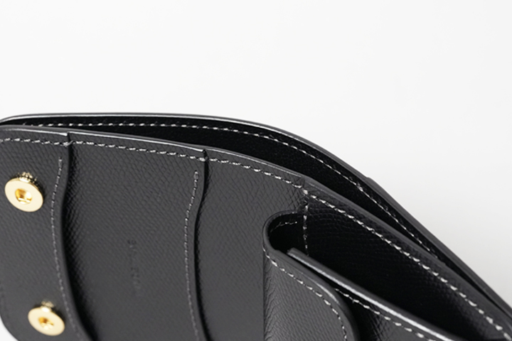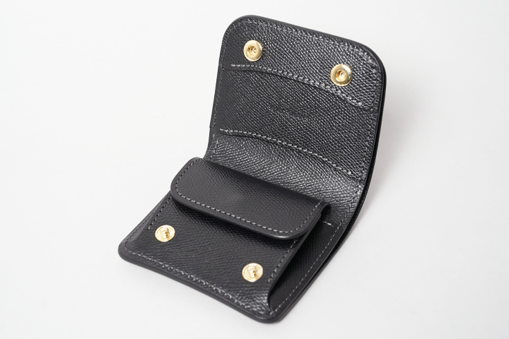 コインケースのファスナーを開くと左側に設けられたマチが開くため、薄型の作りでも視認性や操作性を確保した構造となっています。