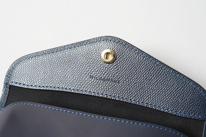 手前側のロゴが入ったポケットは名刺の一時保管場所として、フラップ側のポケットは小物入れとしてお使い頂く方法がおすすめです。