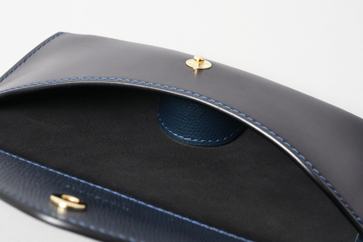 OPTICAL CASEのフラップには1点のホックが設けられています。ホックが1点であることで見た目がスマートになるだけでなく、次の動作へつながりやすいという利点もあります。