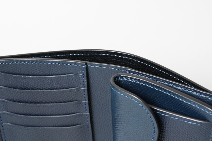 また、外装と内装の2枚の革を立体的に張り合わせることでフラップの中央部分にカーブを形成し、経年と共にフラップが閉じていく際の足がかりとなります。
