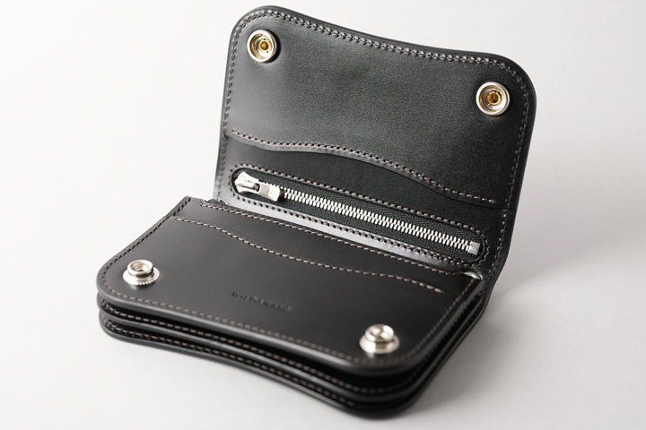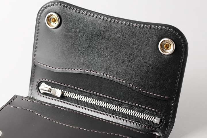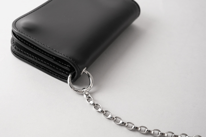 武骨で存在感のある人気のモデルにウォレットチェーン用のハトメを取り付けました。外装、内装にはサドルプルアップのブラックを使用しています。