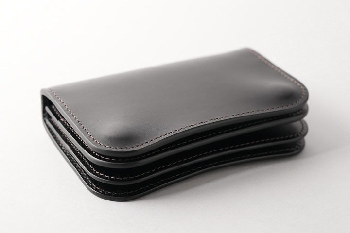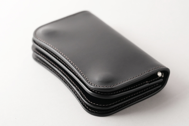 迫力のある4層のコバや、いかにも頑丈そうなフォルムながら分類上は小型のウォレットに位置します。