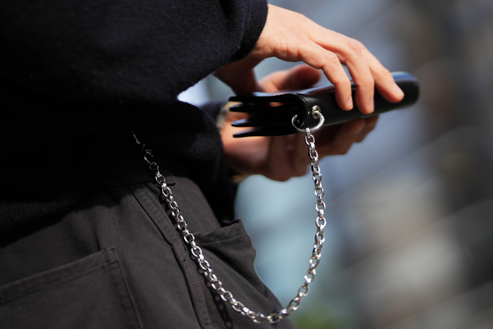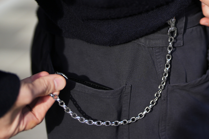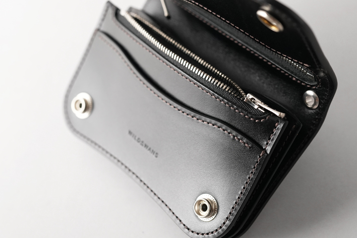 WILDSWANSのウォレット系のアイテムの中でも取り分け印象的なモデルの1つで、武骨なデザインにウォレットチェーンも良く似合います。