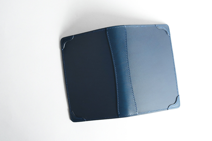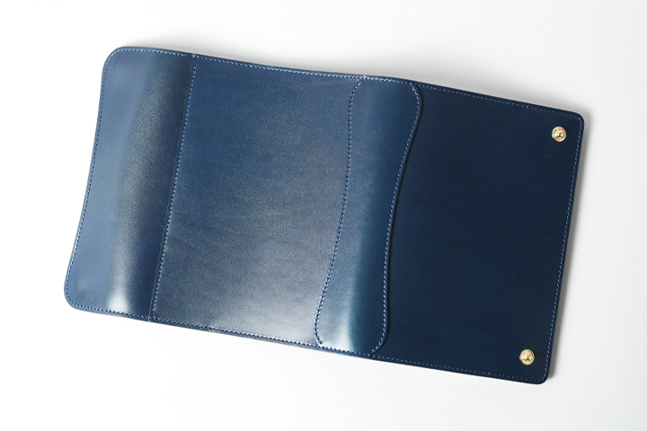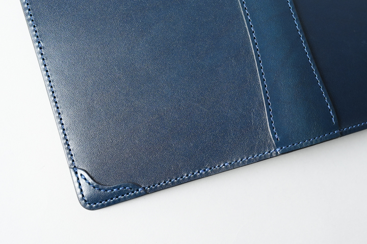 内装は金具の無い総革仕様です。ノートの表紙と裏表紙を差し込むパーツの他に、ペンホルダー、栞やメモを保管できる収納部を設けています。ノートや本が干渉する部分には型押し牛革を使用しており、出し入れの際に傷が付きにくいというメリットがあります。