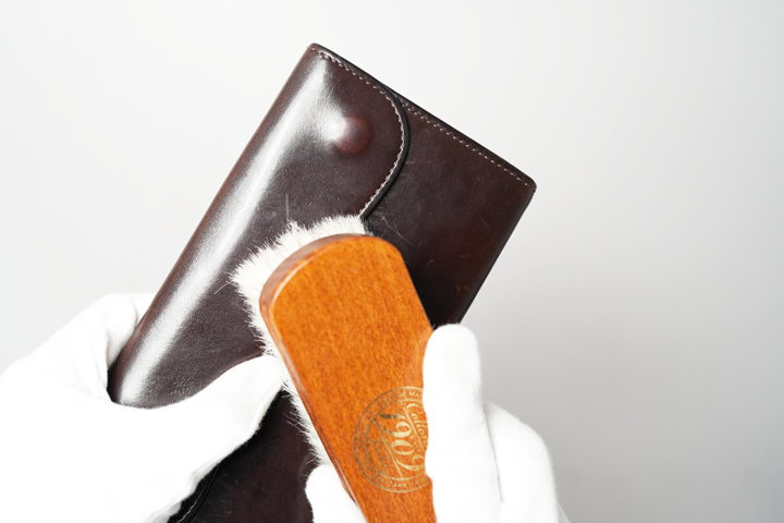 日常的なメンテナンスはブラッシングや乾拭きで十分です。皮革内部には油分がたっぷりと含まれており、使い始めてすぐに、もしくは多量にクリームを塗布すると曇りの原因となる可能性がございますのでご注意下さい。汗や水気をできるだけ避けて定期的にブラッシングすることで、経年と共に美しい光沢があらわれます。