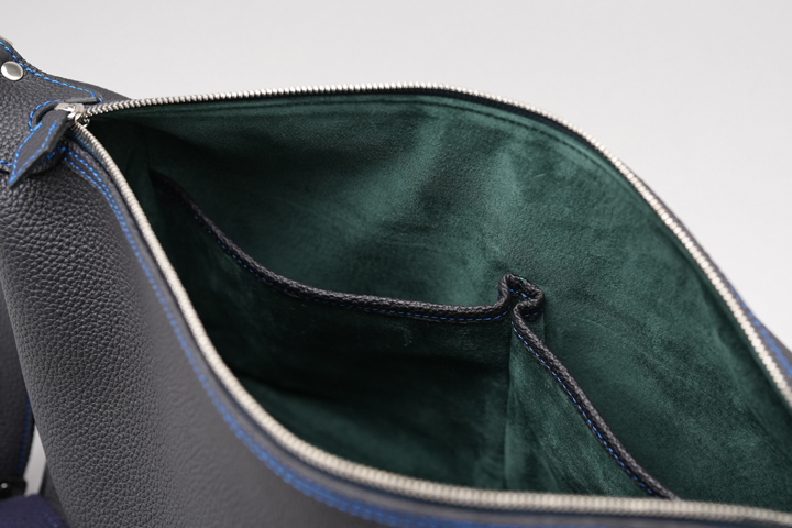 本体の正面にはフラップが付属し、開くとファスナー式の横長のポケットが現れます。 フラップとポケット内部に何気なくあしらわれているのは生地ではなくピッグスエード(起毛させた豚革)です。つまり外装、内装に皮革を使用したフルレザー仕様という、なんとも豪華な作りになっています。