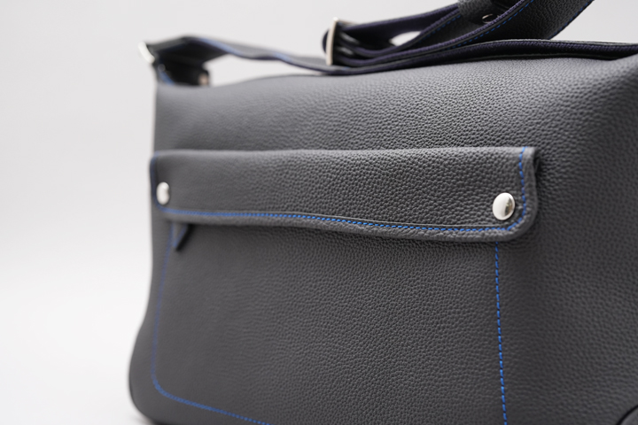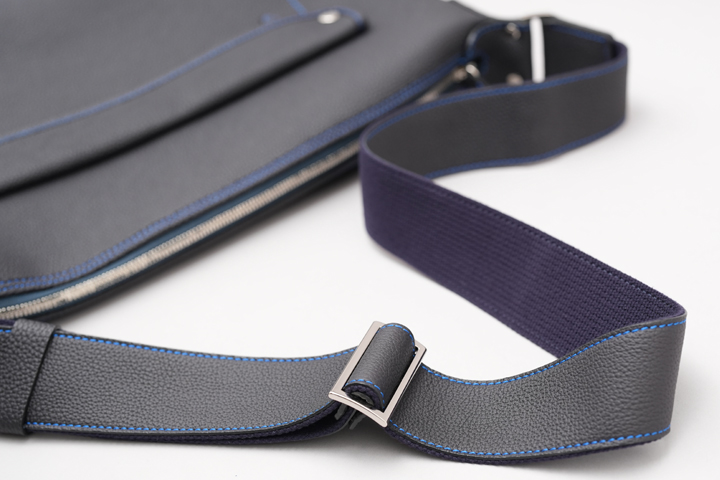 ショルダーストラップは幅5cm程と広めで荷物が重くなっても肩に食い込まず、ベルトの片面には本体と同じ皮革を使用した高級感のある仕様です。バックルによってストラップ長は無段階調節が可能なため、幅広い方にお使い頂くことが出来ます。 肩に当たる部分には生地テープを用いることで滑り止めと汗や強い摩擦による移染の防止の役割を果たしています。