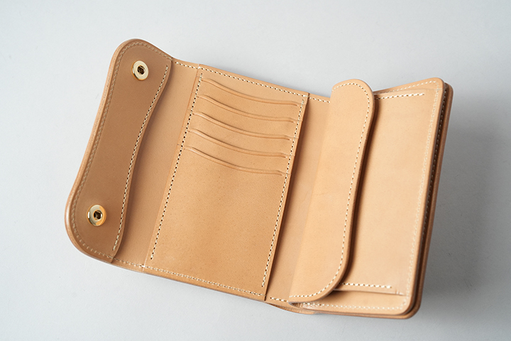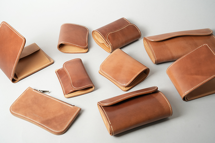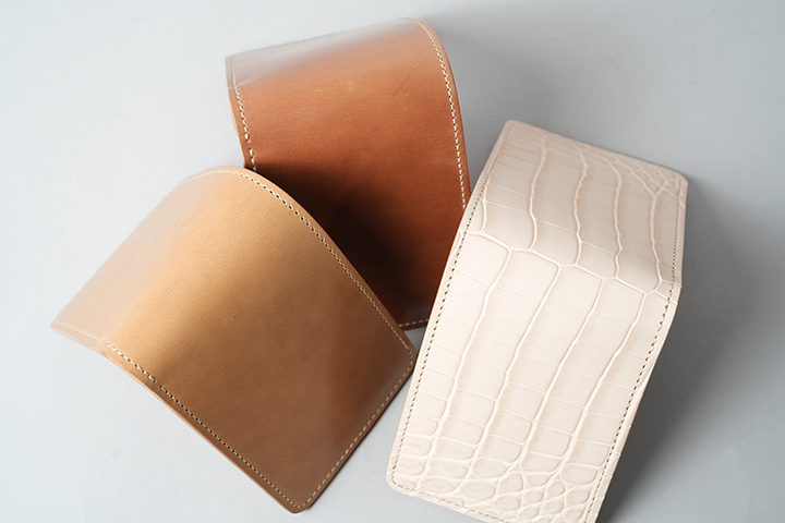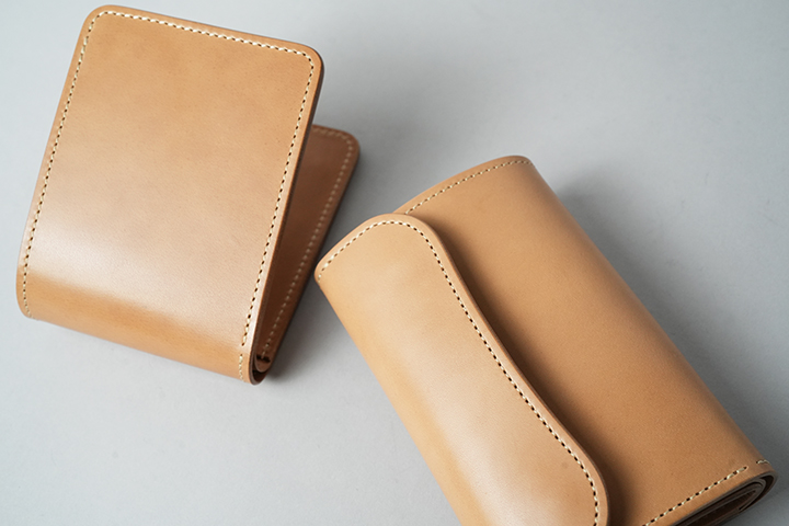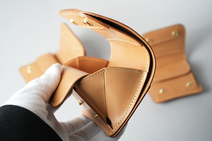 しかし、他のヌメ革と比較した場合、バスタン&フィスはサドルプルアップも凌ぐほどの非常に強いハリ感を持ち合せています。さらに手に吸い付くようなしっとりとした手触りは、革小物として直接手にして頂くことでその価値がさらに高まります。2024初売りの際は、内装や裏貼りにサドルプルアップのナチュラルを組み合わせていましたが、今回は内装や裏貼りも含めすべての皮革使用箇所にバスタン&フィスを用いる「“フル“バスタン&フィス」バージョンでの登場です。