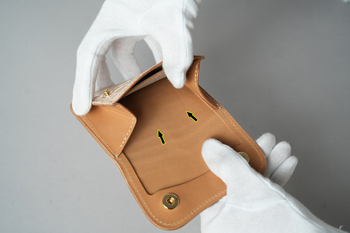 例1)上の画像では、TONGUEの内装にある革の仕切りである「ベロパーツ」の跡を掲載しています。
