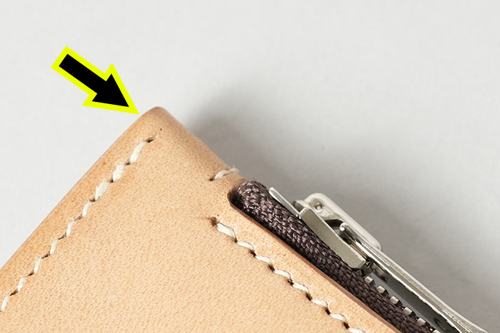 EXTRA THICK WALLETは厚みがあるアイテムのため、縫製の始点や終点のミシン穴が大きくなる傾向があります。また、縫製の始点の上には製作上の印となる小さな穴があります。いずれもご使用に支障をきたすものではありませんが、製品特性となりますのであらかじめご了承ください。