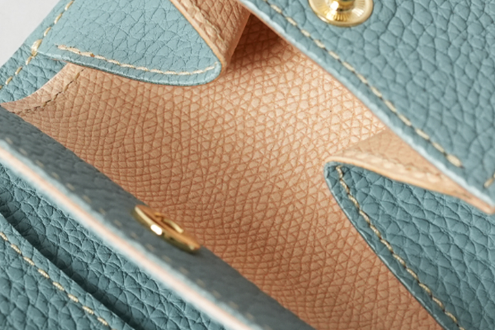 スカイブルーのみ、内装の裏貼り部分にサドルプルアップ/ナチュラルに型押しを施したものを使用しています。 サドルプルアップは堅牢で耐久性が高く、永くお使い頂いてもハリ感が損なわれにくい皮革です。ナチュラルカラーはエイジングの度合いが大きく、濁りの無いピュアな表情を持っています。使い込む程に皮革表面には力強い光沢が現われ、色味は段々と飴色のように深くなっていきます。
