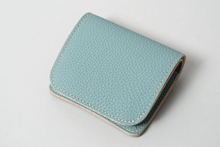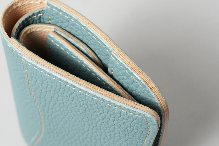 灰みのある優しい印象のライトブルー。霞がかった春の空を思わせるようなカラーです。 裏貼りの型押しサドルプルアップ/ナチュラルに合わせたライトべージュのステッチとスカイブルーの組み合わせからは、ライトデニムのようなカジュアルさも感じられます。