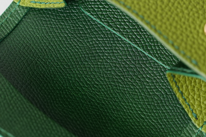 内装にはイタリア・ワルピエ社が製造するブッテーロに型押しを施したものを使用しています。 牛革の中でも平均的に厚めの成牛の肩(ショルダー)の部分を植物性タンニンで鞣し、染料による染色を行い、自然の風合いを残した仕上げを施しています。 油分が潤沢に含まれているため使い込むほどに艶は増し、鮮やかなカラーリングは深みを増し、美しいエイジングをお楽しみいただけます。