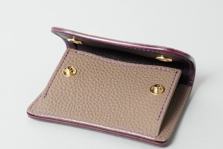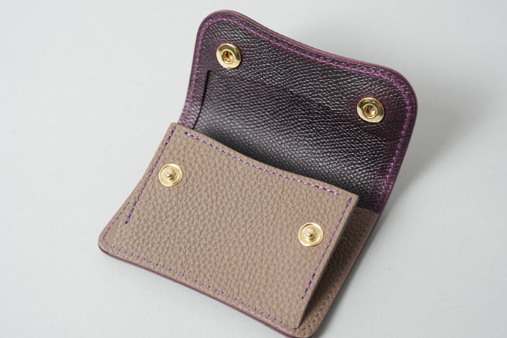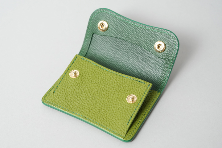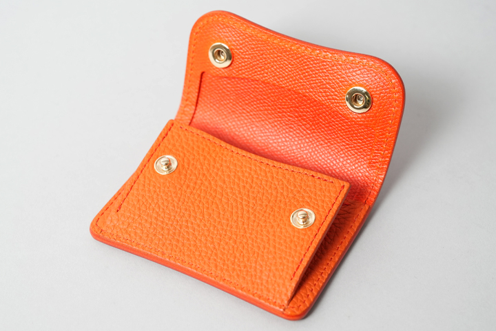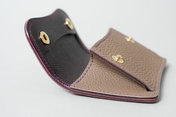 コインケースの両脇には、上部が大きく開く中折れのマチが備えられています。収納部が大きく開き、収納した物の出し入れを容易に行うことが出来ます。