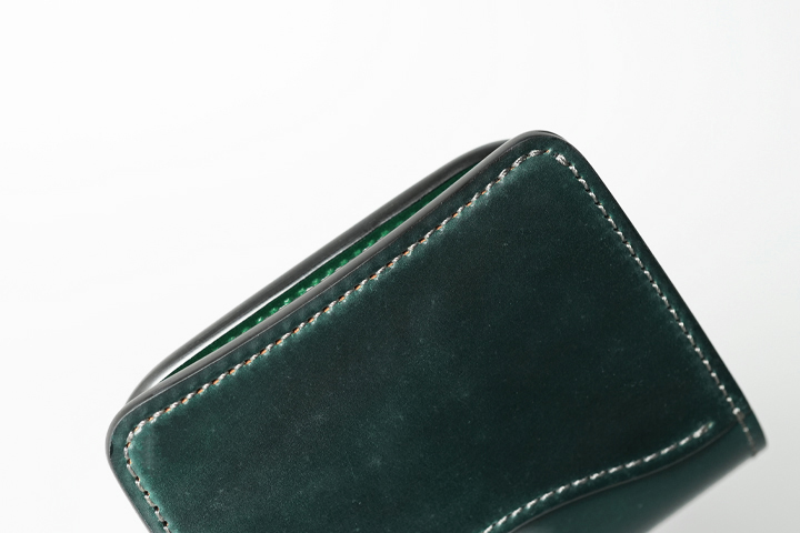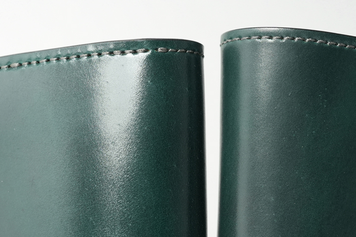 アメリカ・ホーウィン社は最高級シェルコードバンを造る老舗のタンナーです。馬の臀部の内部にある「コードバン層」という高密度の繊維の集まりであることから、牛革と比べると折り曲げに強くしわが発生しにくいという特徴があります。 シェルコードバンのグリーンはクロコダイルのハンターグリーンとはまた違った落ち着きがあります。 特有の色ムラや柔らかな艶感に加え、曇り、繊維のざらつき、ピンホールなどが存在しますが、これらは革の風合いを損ねない自然な仕上げを施している証拠です。長年使い込むほどに起き上がっていた繊維は寝て滑らかな質感になり、新品時よりも透明度が増す美しい艶感を楽しむことができる、育てがいのある素材なのです。