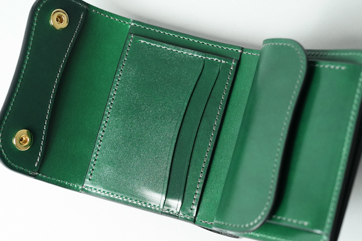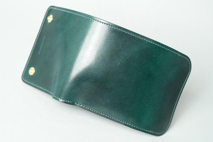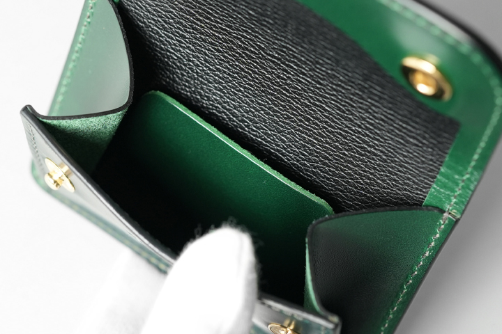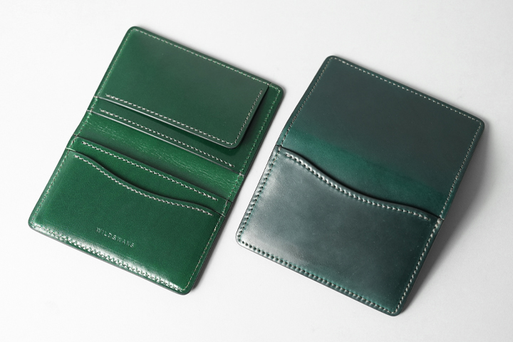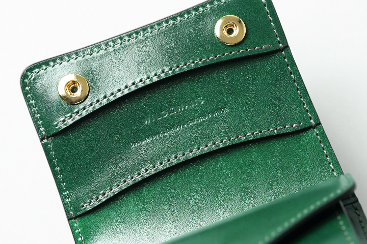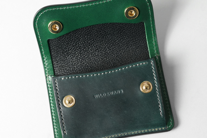 フラップを開けば、シェルコードバンに刻印されたWILDSWANSのロゴ、鮮やかなサドルプルアップの細かなパーツが現れ、異なる素材のグリーンを同時に目にすることができます。