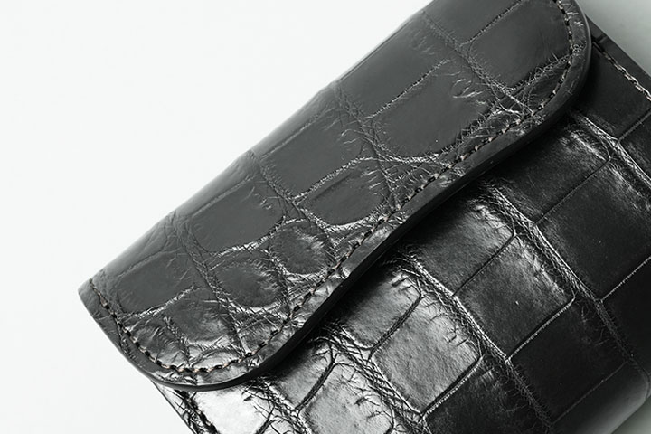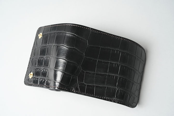 外装の背面はWILDSWANSが展開するミニウォレットのCASAやPALM-V2などと異なり、ポケットなどの付属パーツが付かない仕様です。今回のクロコダイルバージョンでは背面においても迫力のある見た目になります。