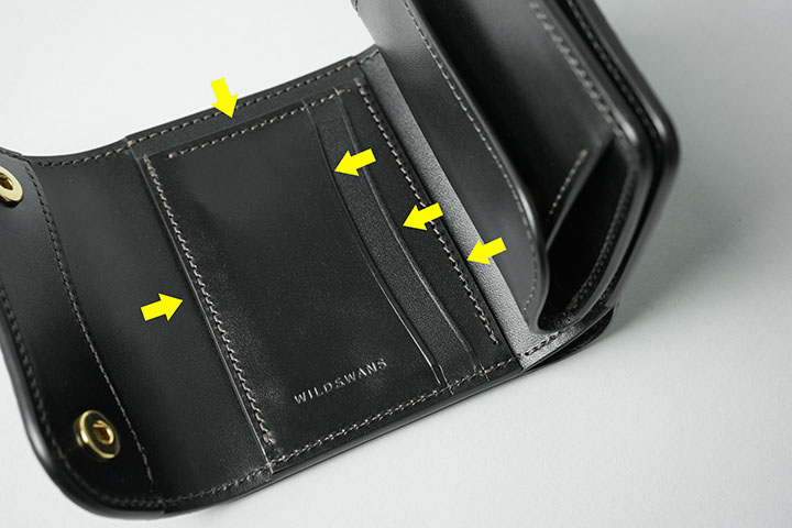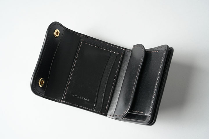 中央部分のコインケースには左右または上から合計5枚のカードの収納が可能です。カード段ポケットの奥のスペースは左右で独立した収納部になっているため、左右それぞれから収納したカードは干渉しない仕組みになります。また、WILDSWANSのロゴはこのカード収納部に刻印されています。