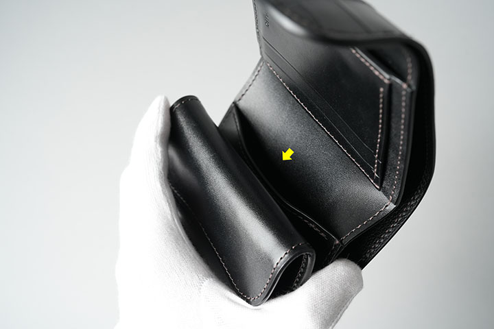 コインケースの奥にもカードポケットをご用意しています。一見取りにくそうに見えるかもしれませんが、ポケットの開口部はしっかり開くのでカードの出し入れはそれほど難しくありません。こちらの収納目安としては、カード1枚程度でしょうか。
