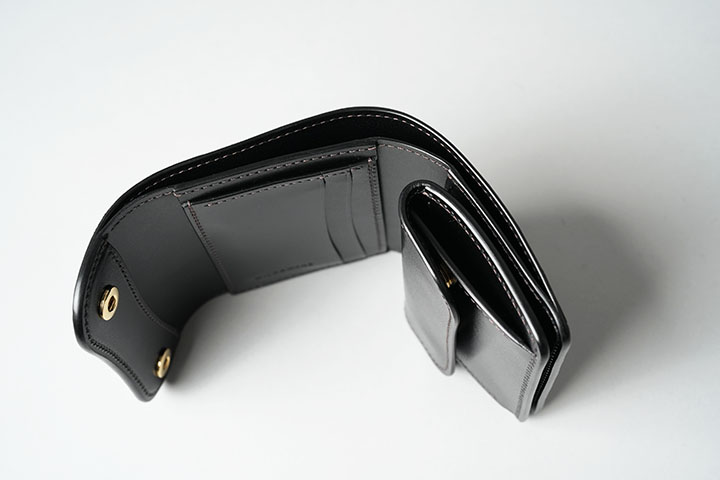 札室は本体のサイドに設けています。ENOはコンパクトとはいえ三つ折りの構造により札室部分ゆとりを持って収納が可能です。なお、この部分には型押しの牛革をあしらっています。札室の収納の目安としてENOには約28枚の一万円札が収納できます。