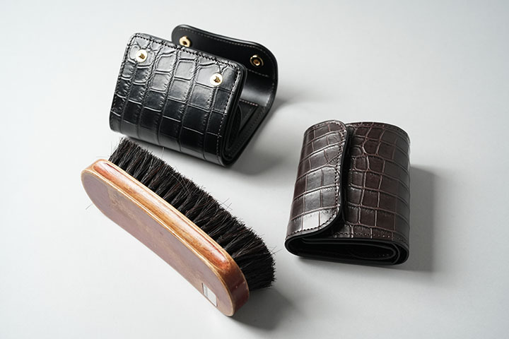 しかし、財布はあくまで道具の一つです。クロコダイル製品だからといってデリケートになり過ぎる必要はなく、適切なメンテナンスを施すことでより良いコンディション、エイジングをお楽しみ頂けます。具体的なメンテナンス方法としては、数か月に一度のブラッシングと柔らかい布を使用しての乾拭きです。一方でクリームの過剰塗布は曇りの原因になり得ることもあります。少なくともご使用から1年程度は、クリームの使用を見送って頂いても構いません。クロコダイルも適切な使用とメンテナンスを心掛けることで、使用から数年後には美しくも艶めかしいエイジングを遂げます。
