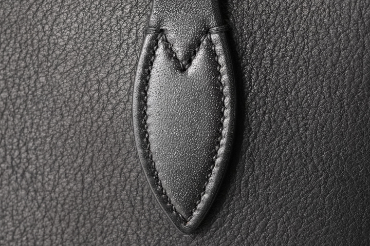 製品中最も負荷の掛かるハンドル基部は手縫いで縫製されています。ハンドルと胴部分のパーツを合わせた厚みは8mmにもなりますが、バッグの顔とも言えるような部分のために細かいピッチで仕上げられており、ドレスシューズとの親和性を図った意匠になっています。