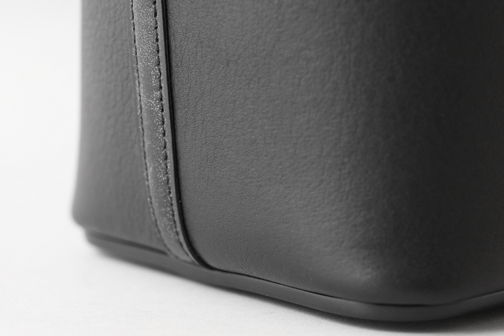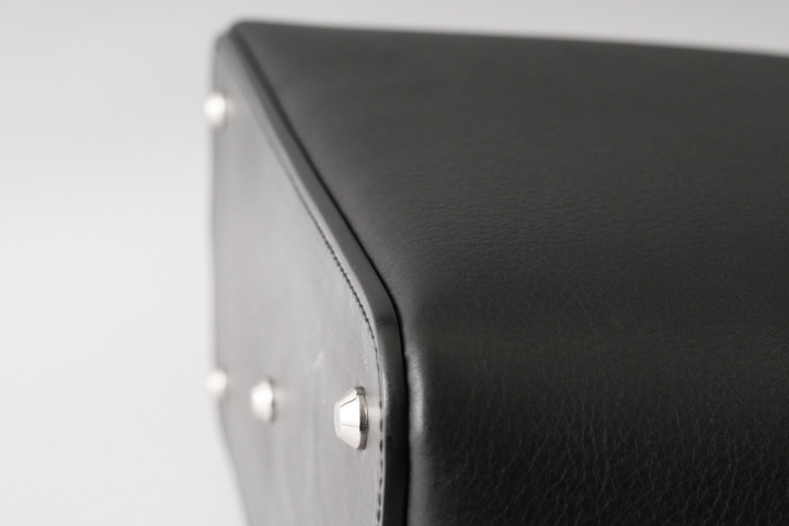 厚み4mm超のフルグレインブライドルレザーに芯材を仕込み、胴部分に縫製されています。底革+胴パーツとこちらも相当な厚みになりますが、美しく、且つ強固に縫製されています。 また底部分の四隅と中央には底鋲が取り付けられており、床置きの際にも安心です。