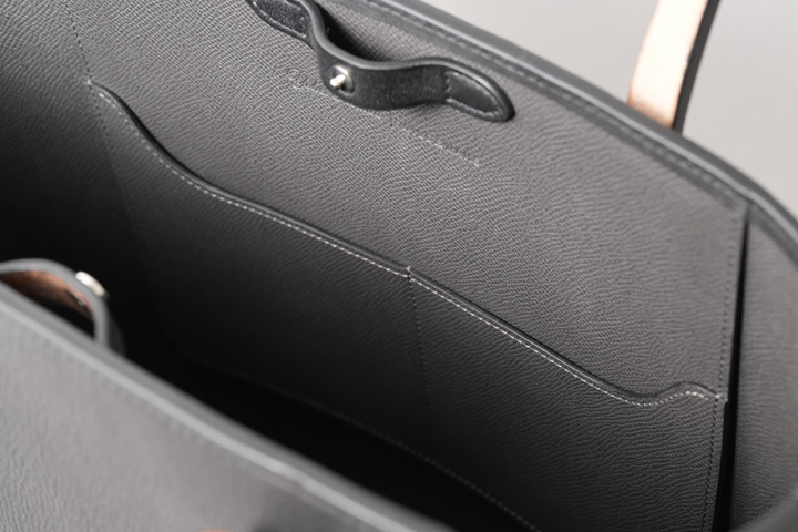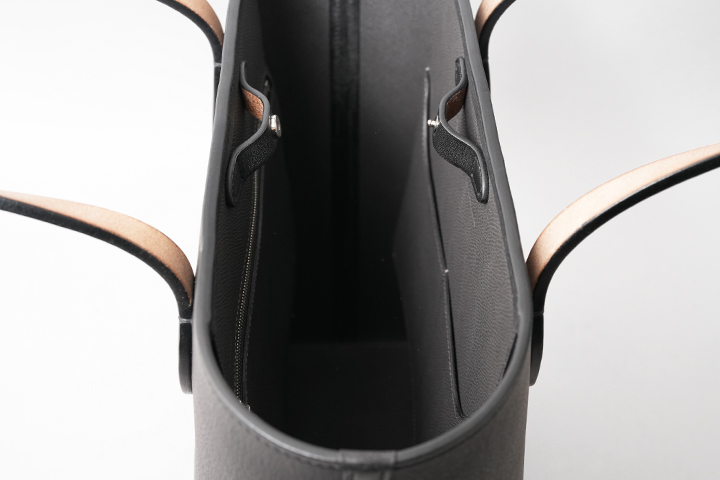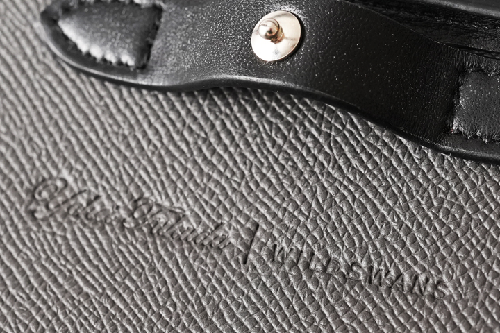 内装素材にはフランス・HAAS社の型押しの牛革、ダービーを使用しています。 品のある細かなシボと発色の良さが特徴のクロム鞣しのカーフ、ダービーは某大手メゾンにも供される上質な皮革で、適度なハリを持ち、傷が付きにくく付いても目立たないというユーザビリティの高い素材です。 カラーはグラファイト(黒鉛)という濃いグレーを使用しており、外装に使用されたブラックの皮革との変化を付けています。