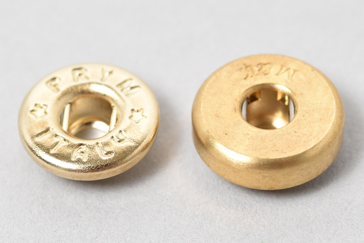 一般的なホックは画像左のように板状の金属をプレス加工して製作されますが、今回使用している画像右のホックは金属の塊を切削して作られた”挽物”になります。