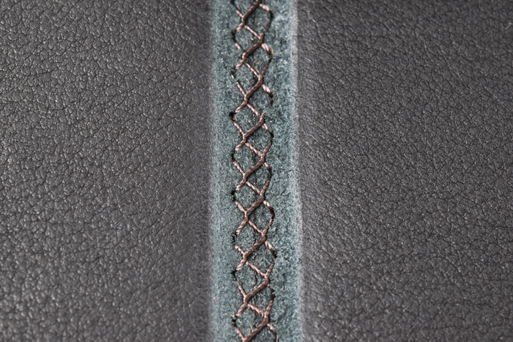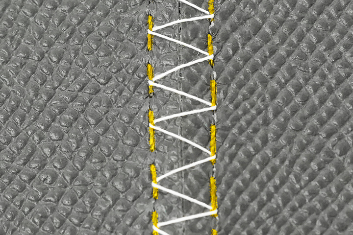 革同士を縫い付けているのではなく、縫製同士をもう一本の糸で締め込んでいるという革巻きのステアリングのような方法で繋ぎ合わせています。
